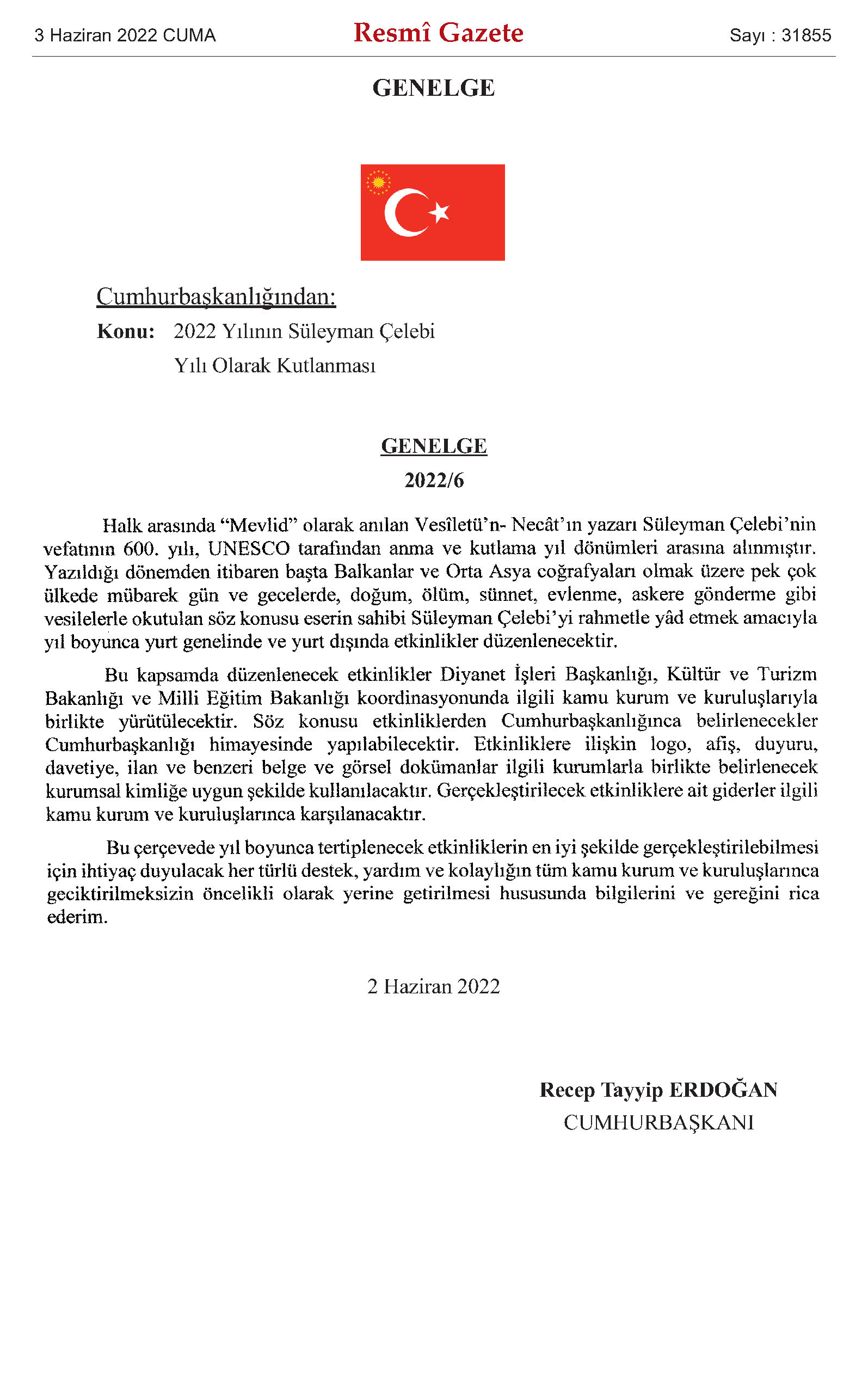 31855 Sayılı Cumhurbaşkanlığı Genelgesi ile 2022 yılının “Süleyman Çelebi Yılı” olarak Sayın Cumhurbaşkanı Recep Tayyip ERDOĞAN’ın himayelerinde ulusal ve uluslararası etkinliklerle anılması kararlaştırılmıştır.