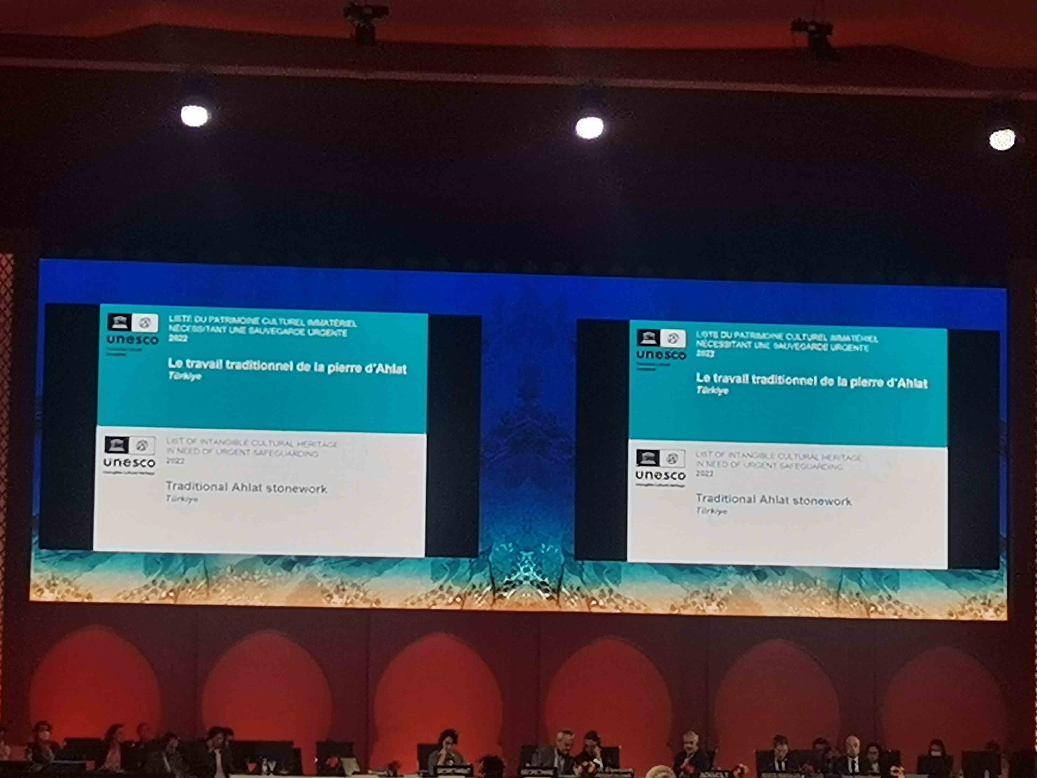 Fas’ın başkanlığında, 28 Kasım - 3 Aralık 2022 tarihleri arasında Fas’ın başkenti Rabat’ta düzenlenmekte olan UNESCO Somut Olmayan Kültürel Mirasın Korunması Hükûmetler Arası Komitesi 17. Oturumunda Türkiye’den “Ahlat Taş İşçiliği Geleneği”, Acil Koruma Gerektiren Somut Olmayan Kültürel Miras Listesine kaydedilmiştir.