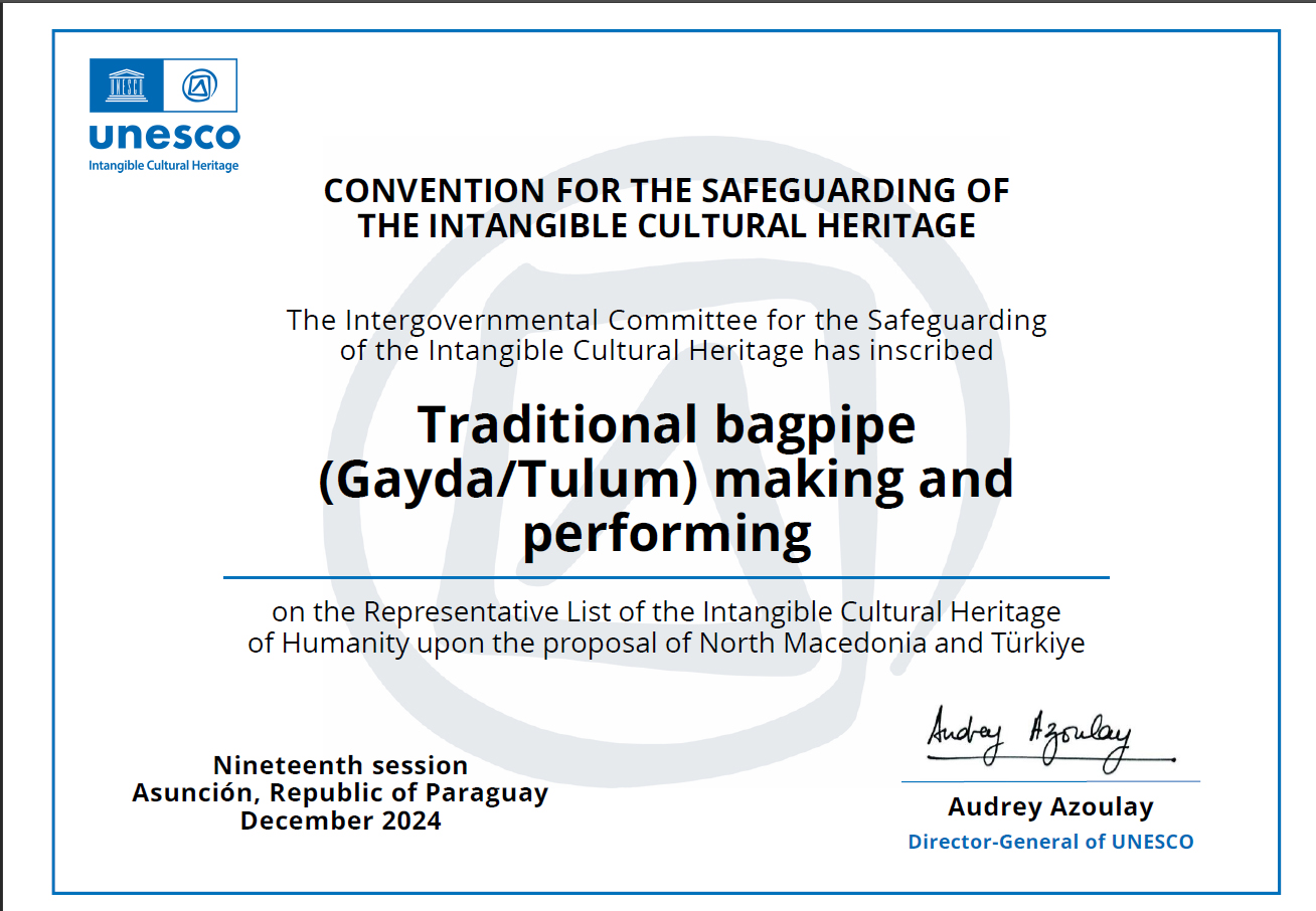 2-7 Aralık 2024 tarihleri arasında Paraguay Cumhuriyetinin Asunción şehrinde gerçekleştirilen UNESCO Somut Olmayan Kültürel Mirasın Korunması Hükûmetler Arası Komitesinin 19. Oturumunda “Geleneksel Gayda/Tulum Yapımı ve İcrası” İnsanlığın Somut Olmayan Kültürel Mirası Temsilî Listesi’ne kaydedildi ve Çok Uluslu “Nevruz” dosyasına Moğolistan’ın katılımıyla dosya genişlemesine gidildi.