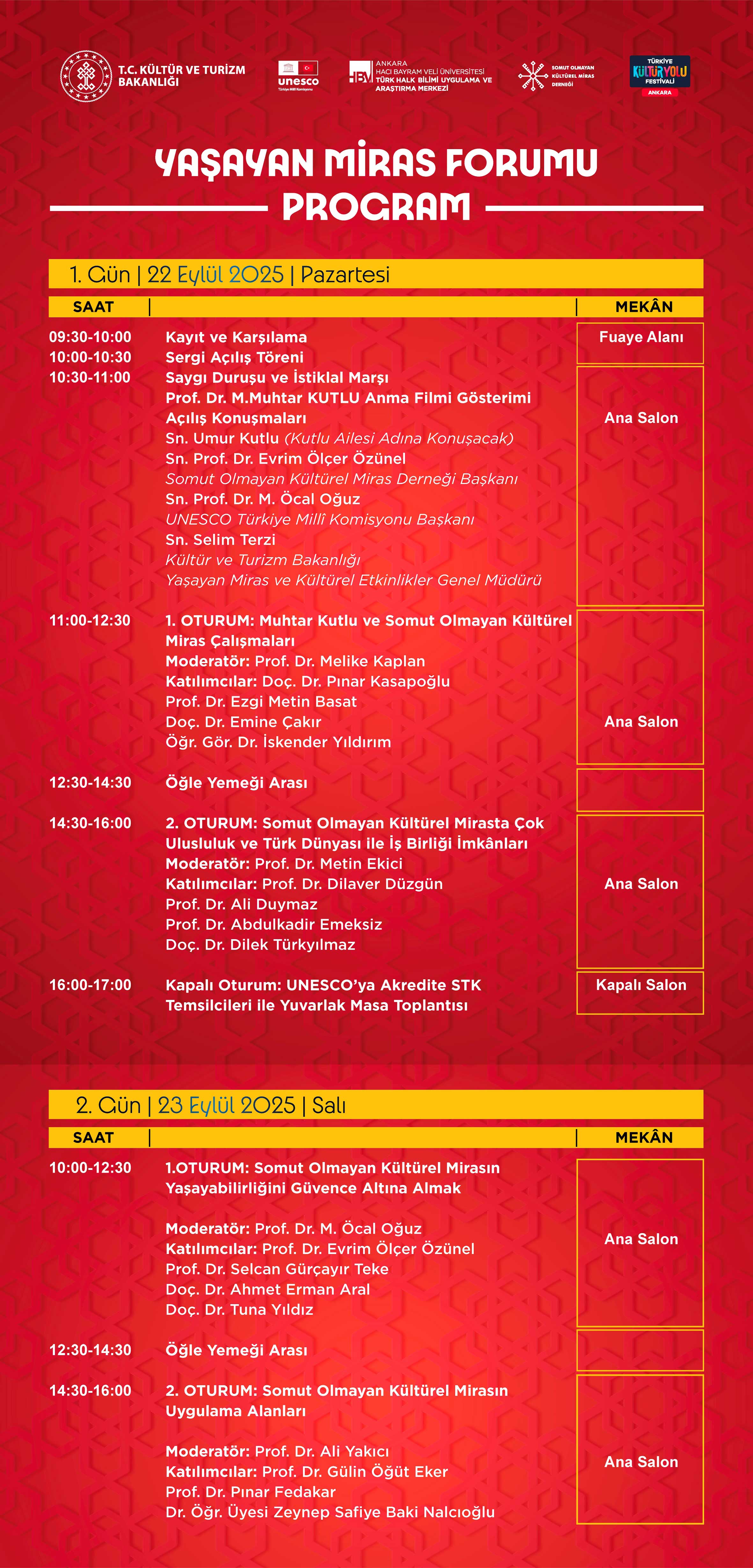Türkiye Kültür Yolu Festivali kapsamında T.C. Kültür ve Turizm Bakanlığı, UNESCO Türkiye Millî Komisyonu, Ankara Hacı Bayram Veli Üniversitesi Türk Halk Bilimi Uygulama ve Araştırma Merkezi ve Somut Olmayan Kültürel Miras Derneği iş birliğinde 22-23 Eylül 2025 tarihlerinde Yurt Dışı Türkler ve Akraba Topluluklar Başkanlığı Binasında (Balgat/Ankara) Yaşayan Miras Forumu düzenlenecektir.