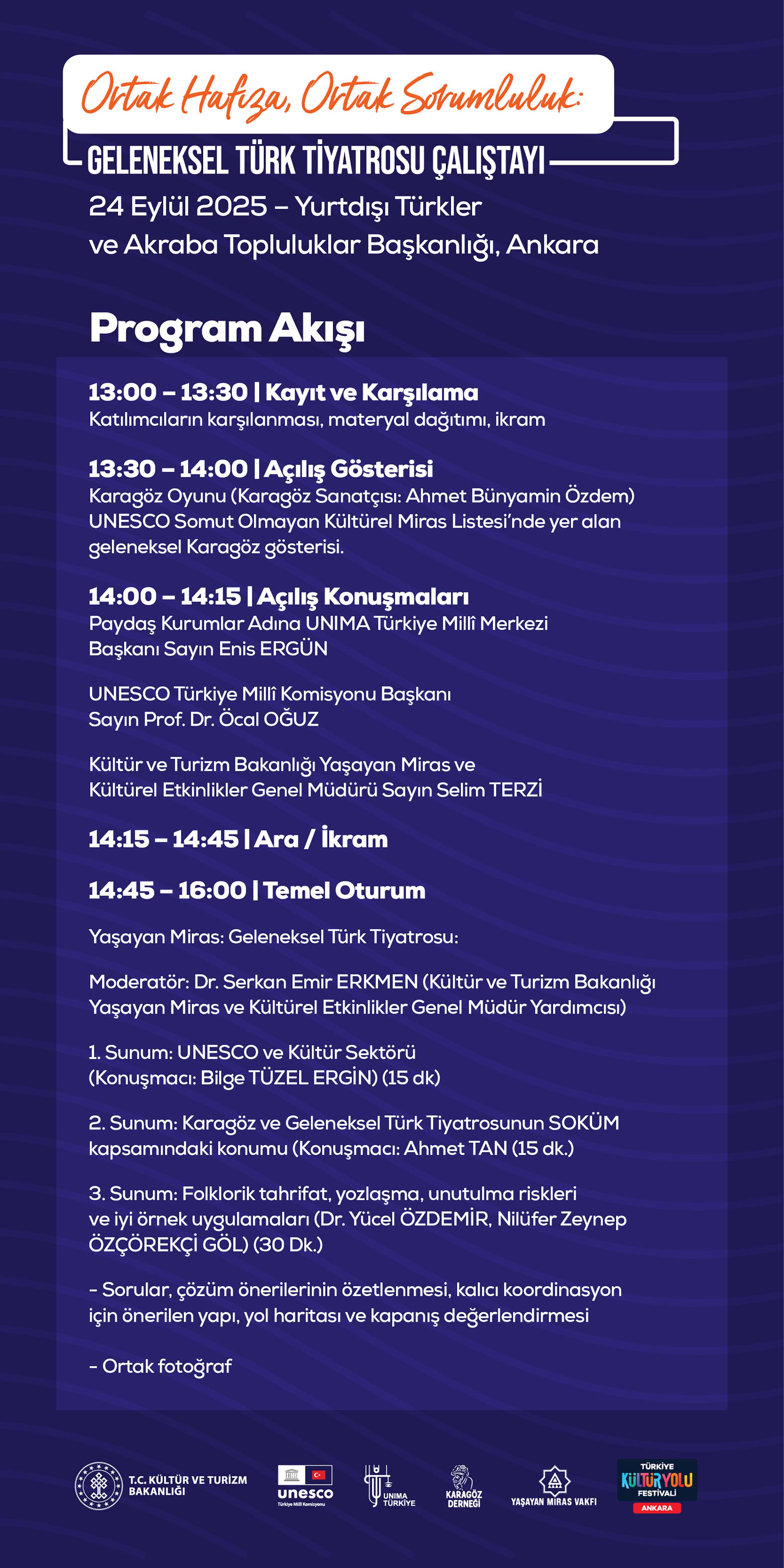 Türkiye Kültür Yolu Festivali kapsamında T.C. Kültür ve Turizm Bakanlığı Yaşayan Miras ve Kültürel Etkinlikler Genel Müdürlüğü, UNESCO Türkiye Millî Komisyonu, UNIMA Türkiye Millî Merkezi, Karagöz Derneği ve Yaşayan Miras Vakfı iş birliğinde Yurt Dışı Türkler ve Akraba Topluluklar Başkanlığı ev sahipliğinde 24 Eylül 2025 tarihinde Ankara’da Ortak Hafıza Ortak Sorumluluk: Geleneksel Türk Tiyatrosu Çalıştayı gerçekleştirildi.