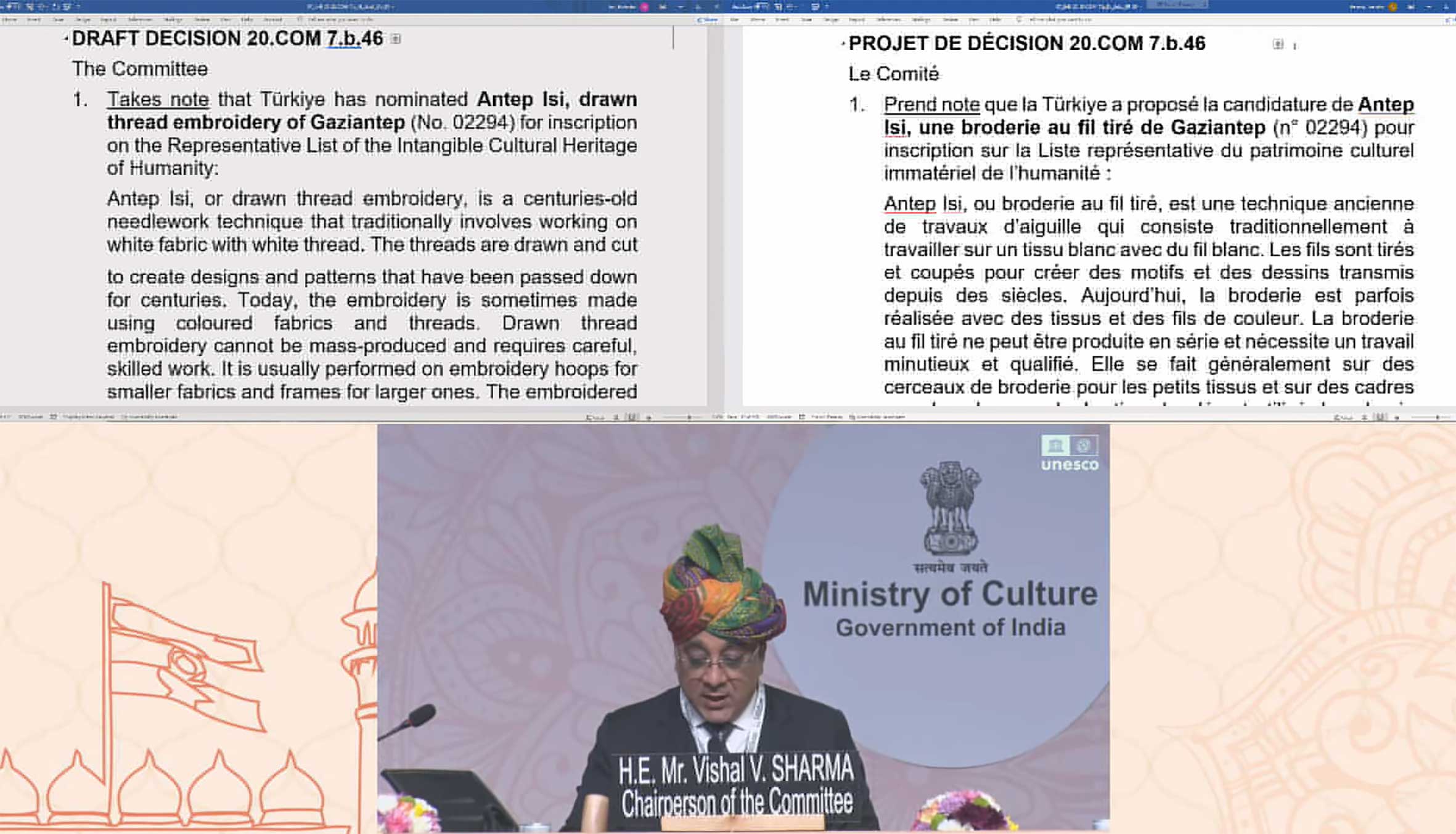 UNESCO Türkiye Millî Komisyonunu temsilen UTMK Somut Somut Olmayan Kültürel Miras İhtisas Komitesi ve Değerlendirme Organı Üyesi Prof. Dr. Evrim ÖLÇER ÖZÜNEL ve UTMK Somut Olmayan Kültürel Miras İhtisas Komitesi Üyesi Doç. Dr. Ahmet Erman ARAL’ın yer aldığı toplantıya, T.C. KTB Yaşayan Miras ve Kültürel Etkinlikler Genel Müdür Yardımcısı Dr. Serkan Emir ERKMEN ile T.C. Dışişleri Bakanlığı ve T.C. Kültür ve Turizm Bakanlığı uzmanları katıldı. T.C. Yeni Delhi Büyükelçisi Ali Murat ERSOY’un da iştirak ettiği toplantıda, Gaziantep Büyükşehir Belediye Başkanı Fatma ŞAHİN başkanlığındaki Gaziantep Büyükşehir Belediyesi ile sivil toplum kuruluşlarının temsilcileri hazır bulundu.