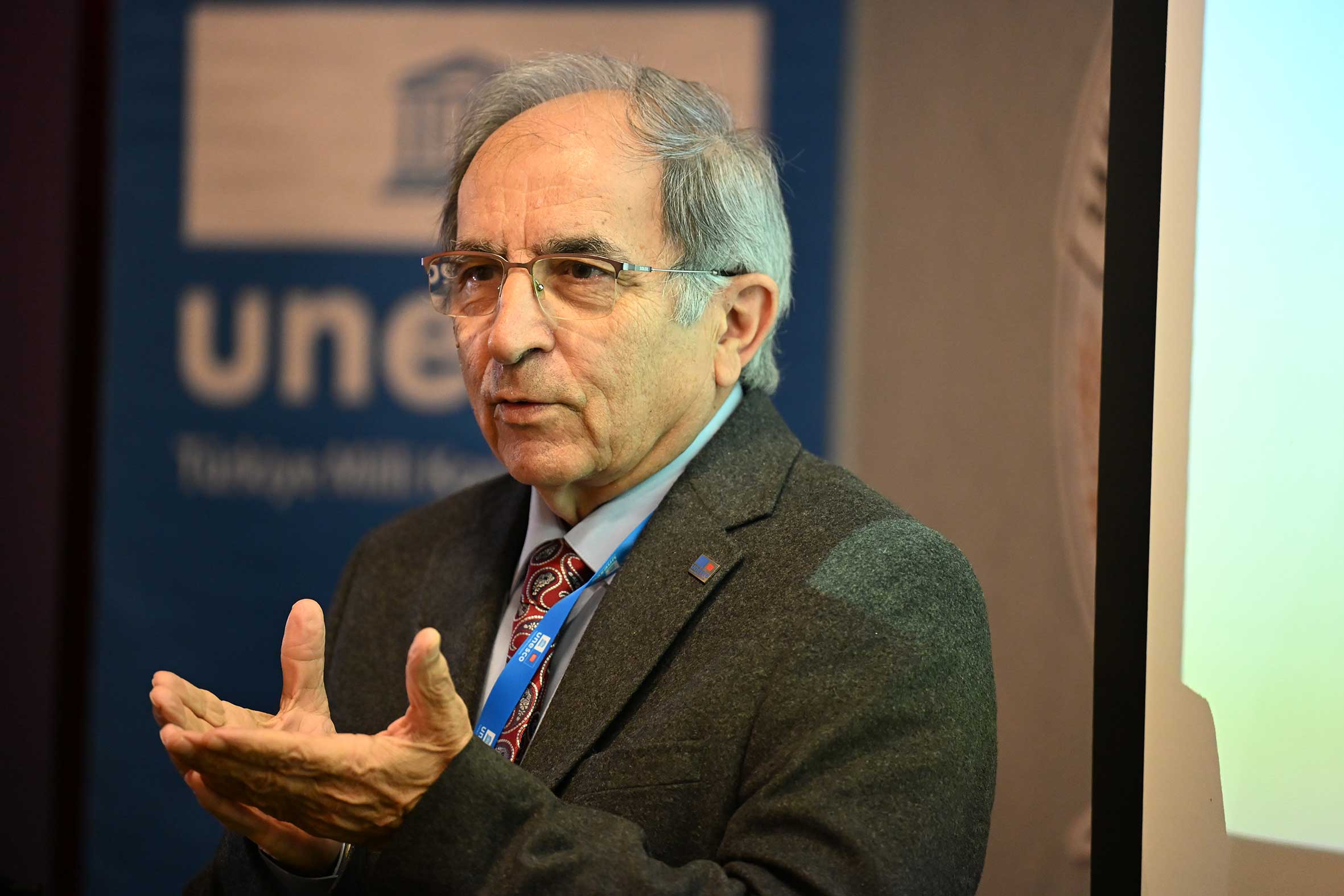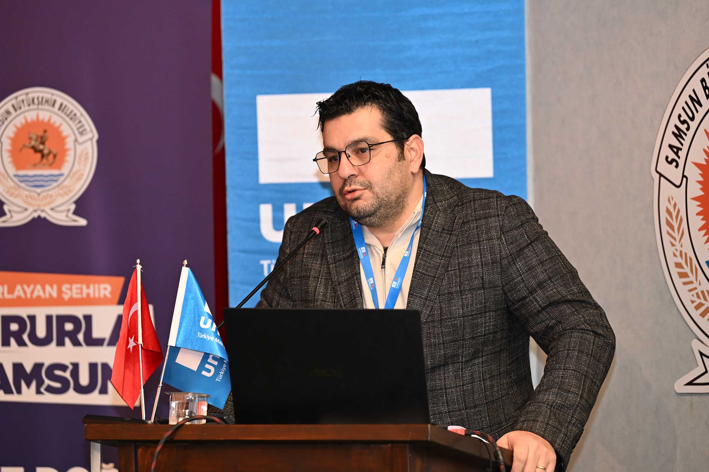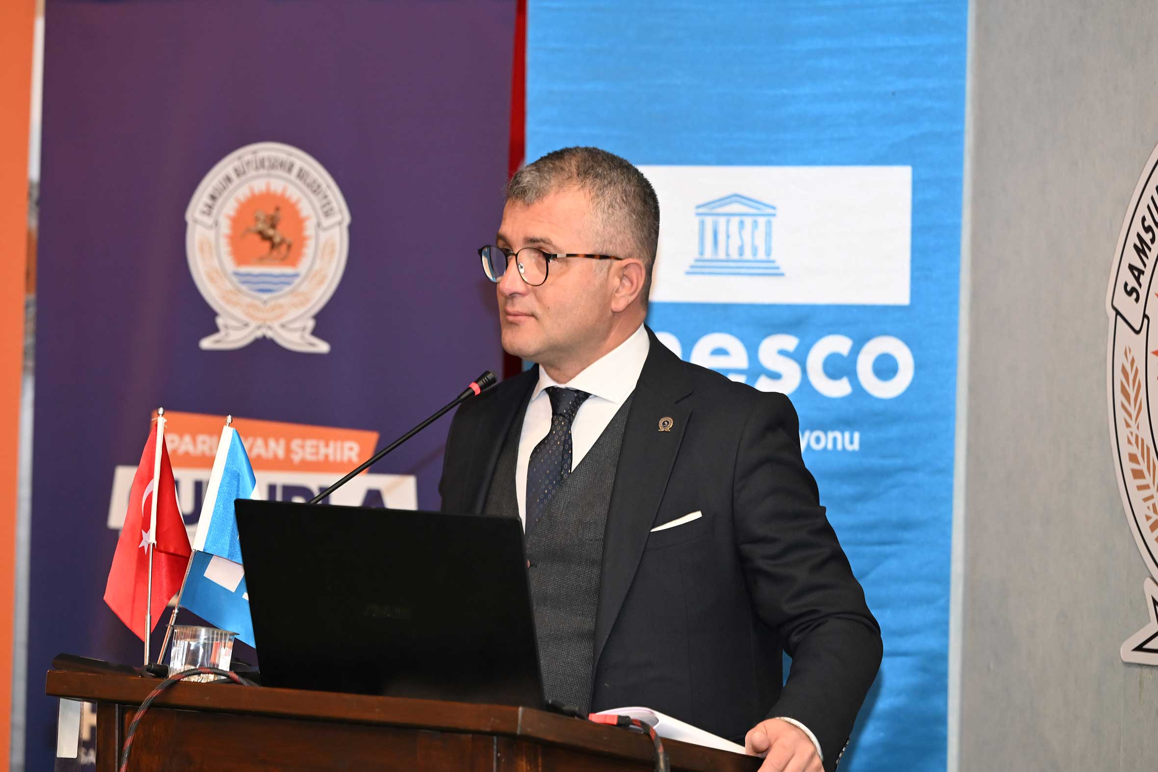Açılış konuşmalarının ardından UNESCO Türkiye Millî Komisyonu Başkanı Prof. Dr. M. Öcal OĞUZ “UNESCO Programları, Yerel Yönetimler ve Somut Olmayan Kültürel Miras Müzeleri” başlıklı sunumunu gerçekleştirdi. Sayın OĞUZ, sunumunda Samsun’un UNESCO listelerine kayıtlı miras alanlarıyla/unsurlarıyla UNESCO programları çerçevesinde yerel yönetimlerin ve müzelerin rolüne değindi. Ayrıca, somut olmayan kültürel mirasın korunması, yaşatılması ve aktarılmasında somut olmayan kültürel miras müzelerinin önemine dikkat çekerek bu müzelerin kurulma ve işletilme süreçlerinde yerel yönetimlerin izlemesi gereken temel ilke ve yaklaşımları ortaya koydu. Açılış konuşmaları bölümü UNESCO Türkiye Millî Komisyonu Başkan Vekili Sayın Prof. Dr. Nizamettin KAZANCI’nın “Jeomitoloji; Sözlü Miras ile Jeolojik Mirasın Buluşması ve UNESCO Yaklaşımı” başlıklı sunumuyla devam etti. Sayın KAZANCI, sunumunda jeolojik oluşumların sözlü kültür, mitler ve anlatılar aracılığıyla nasıl anlamlandırıldığını ele alarak jeomitoloji kavramının kültürel miras çalışmalarındaki yerini ortaya koydu.