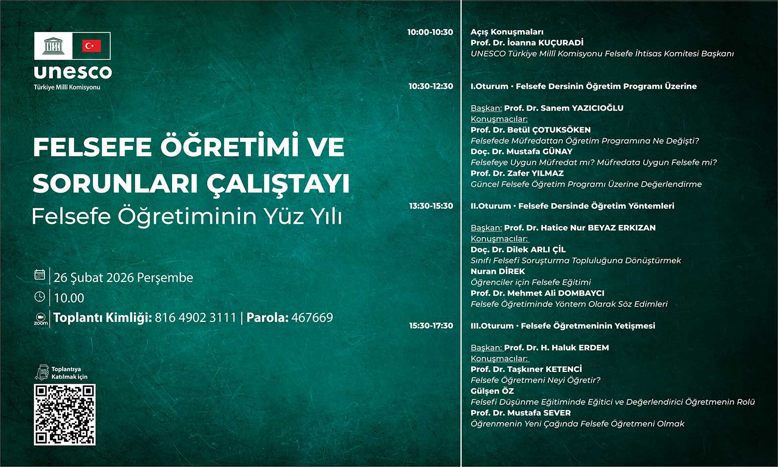 UNESCO Türkiye Millî Komisyonu, Felsefe Öğretimi ve Sorunları Çalıştayı FELSEFE ÖĞRETİMİNİN YÜZ YILI başlıklı çevrim içi bir etkinlik düzenlemektedir.