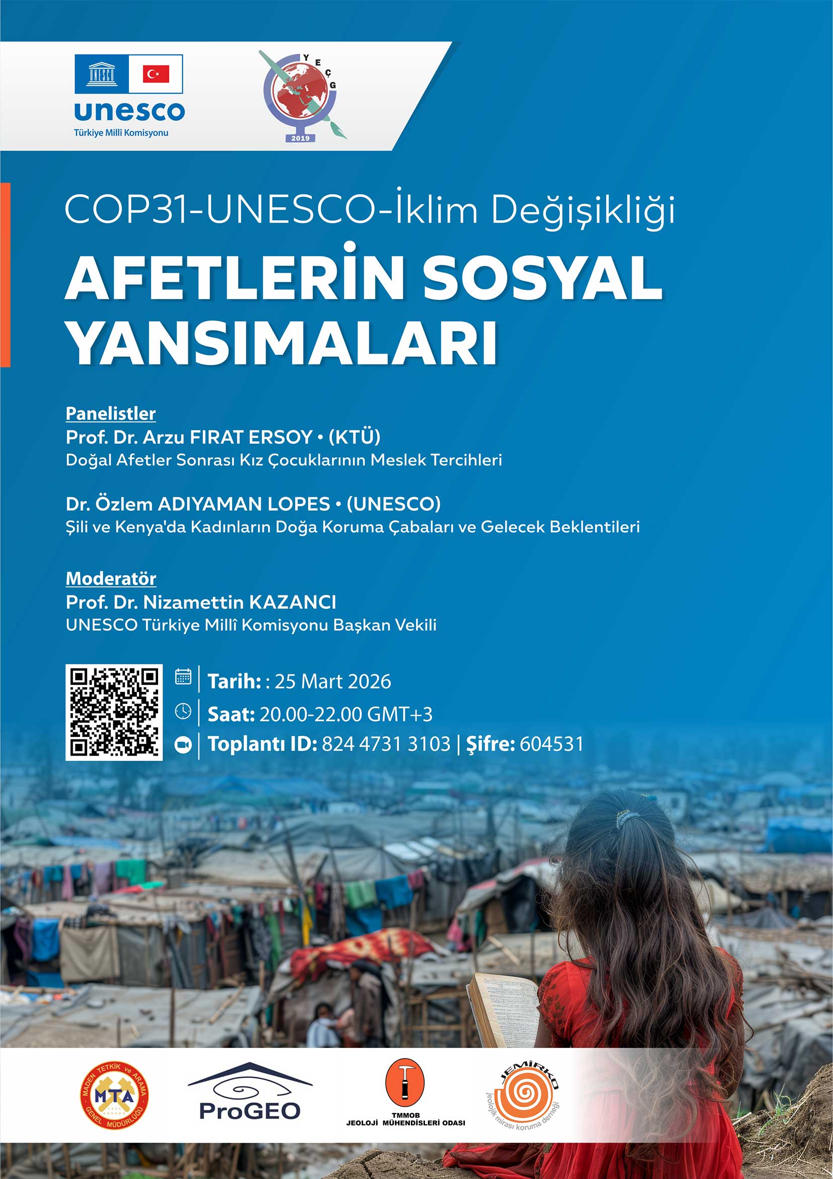 25 Mart 2026 tarihinde, UNESCO Türkiye Millî Komisyonu ve JEMİRKO Yer Bilimleri Alt Çalışma Grubu iş birliğiyle, COP31-UNESCO-İklim Değişikliği temasıyla “Afetlerin Sosyal Yansımaları” başlıklı çevrim içi bir panel gerçekleştirilecektir.
