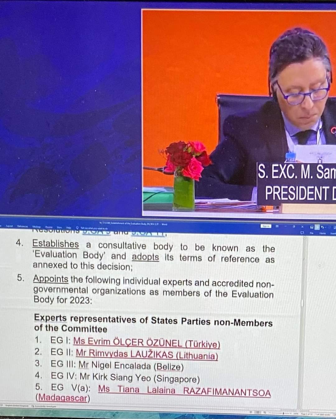 28 Kasım-3 Aralık 2022 tarihleri arasında Fas’ın başkenti Rabat’ta gerçekleştirilen UNESCO Somut Olmayan Kültürel Mirasın Korunması Sözleşmesi Hükûmetler Arası Komitesi’nin 17. Oturumunda altı uzman ve altı sivil toplum kuruluşundan oluşan ve listelere aday gösterilen unsurları inceleyerek Komiteye tavsiye kararı veren Değerlendirme Organı’na birinci seçim grubundan Türkiye’nin adayı olan Doç. Dr. Evrim ÖLÇER ÖZÜNEL seçildi.