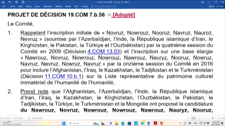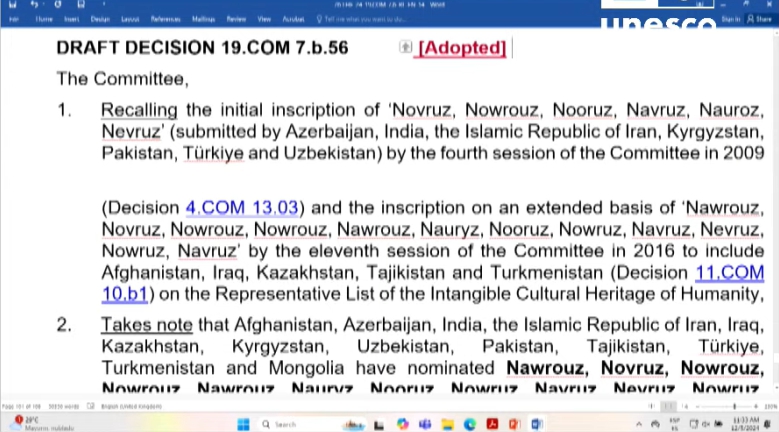 4 Aralık 2024 tarihinde adaylık dosyalarının incelemeleri devam ederken 5 Aralık 2024 tarihinde Afganistan, Azerbaycan, Hindistan, İran, Irak, Kazakistan, Kırgızistan, Özbekistan, Pakistan, Tacikistan, Türkmenistan ve Türkiye’nin çok uluslu dosya olarak Temsilî Liste’ye kayıtlı “Nevruz” dosyasına Moğolistan katıldı.