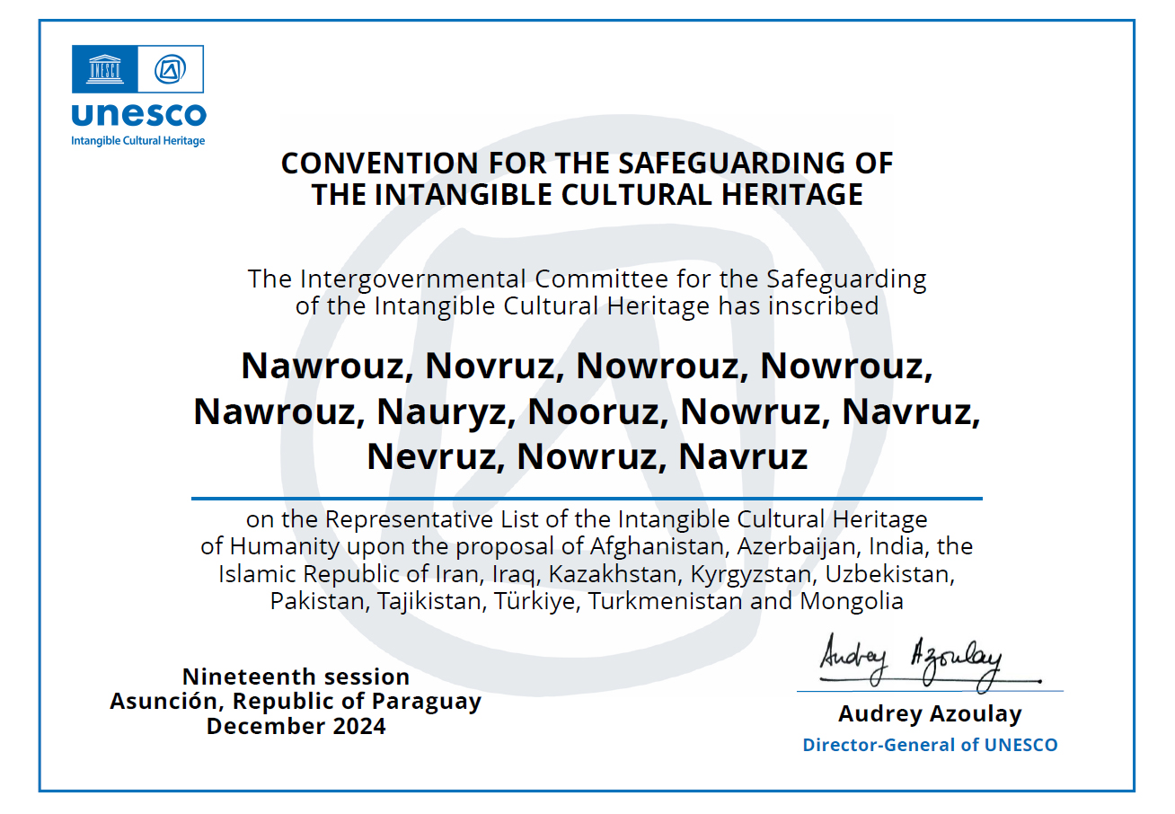 2-7 Aralık 2024 tarihleri arasında Paraguay Cumhuriyetinin Asunción şehrinde gerçekleştirilen UNESCO Somut Olmayan Kültürel Mirasın Korunması Hükûmetler Arası Komitesinin 19. Oturumunda “Geleneksel Gayda/Tulum Yapımı ve İcrası” İnsanlığın Somut Olmayan Kültürel Mirası Temsilî Listesi’ne kaydedildi ve Çok Uluslu “Nevruz” dosyasına Moğolistan’ın katılımıyla dosya genişlemesine gidildi.