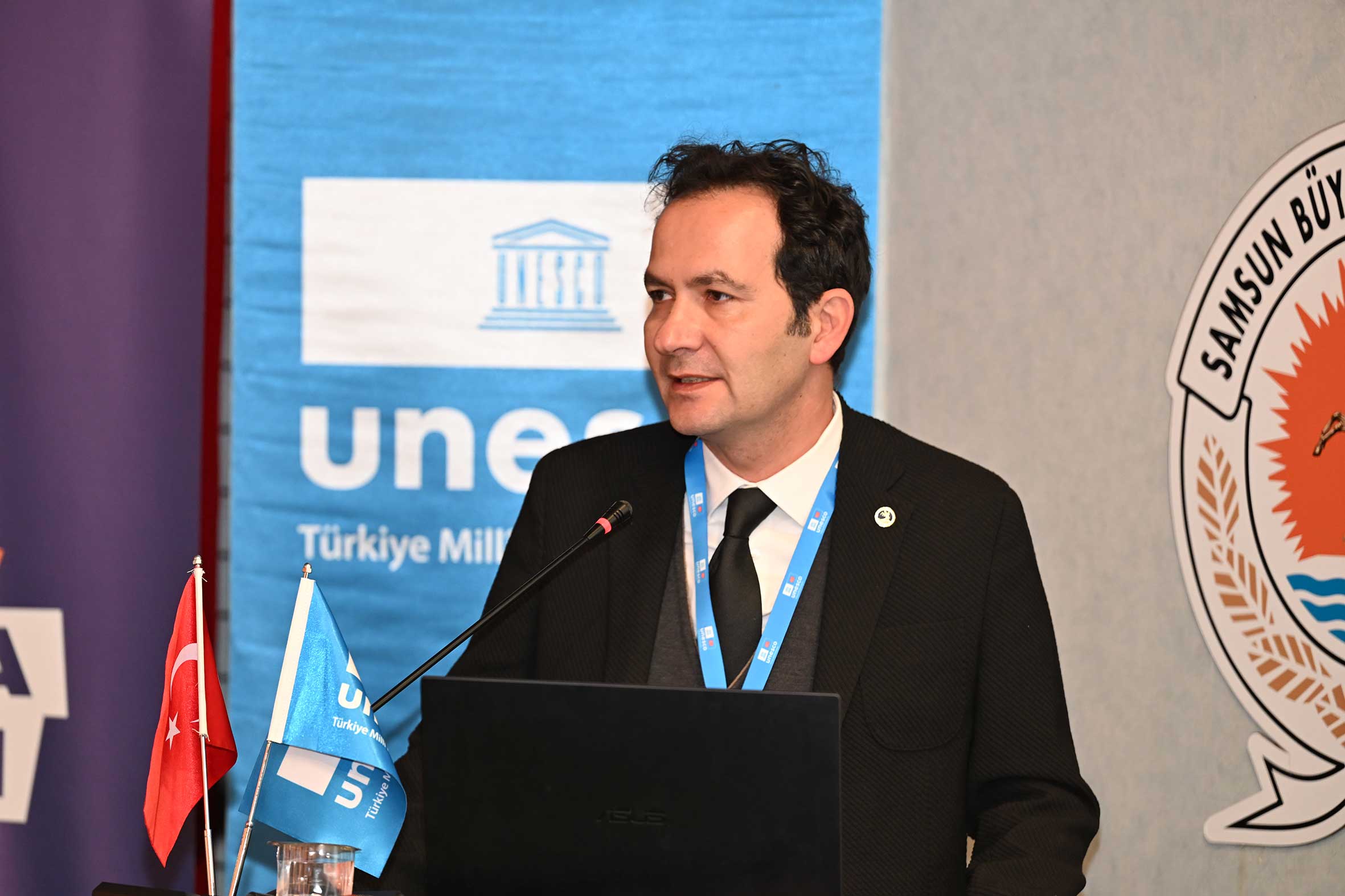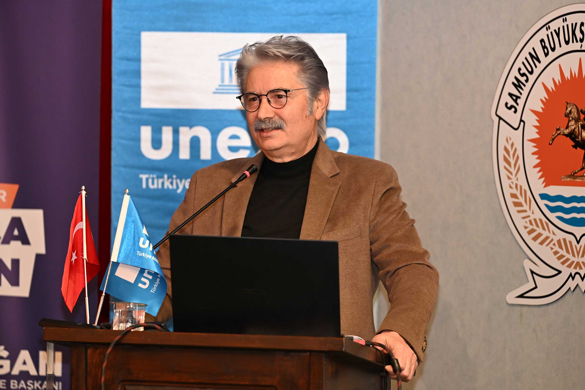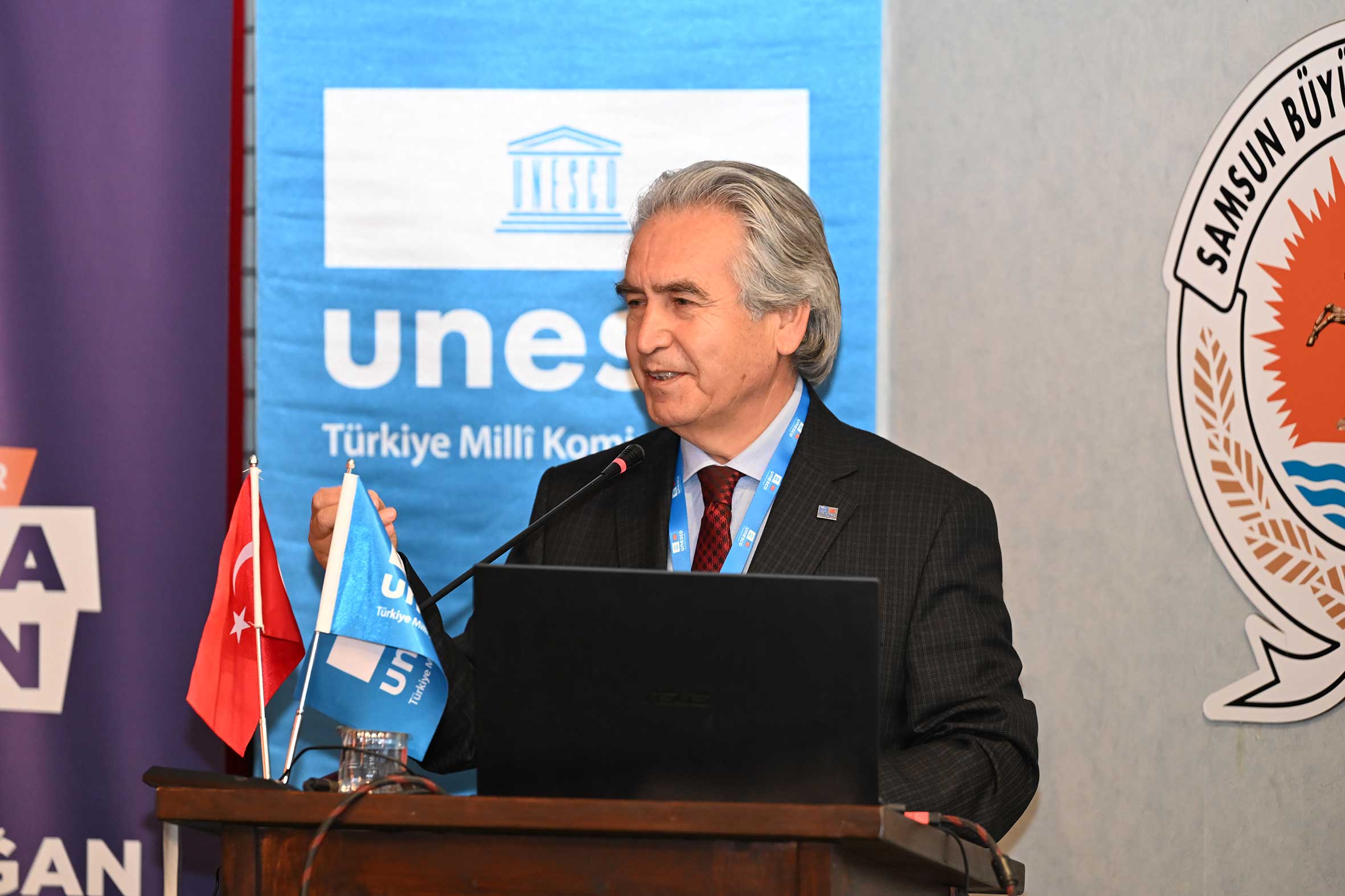 Açılış konuşmalarının ardından UNESCO Türkiye Millî Komisyonu Başkanı Prof. Dr. M. Öcal OĞUZ “UNESCO Programları, Yerel Yönetimler ve Somut Olmayan Kültürel Miras Müzeleri” başlıklı sunumunu gerçekleştirdi. Sayın OĞUZ, sunumunda Samsun’un UNESCO listelerine kayıtlı miras alanlarıyla/unsurlarıyla UNESCO programları çerçevesinde yerel yönetimlerin ve müzelerin rolüne değindi. Ayrıca, somut olmayan kültürel mirasın korunması, yaşatılması ve aktarılmasında somut olmayan kültürel miras müzelerinin önemine dikkat çekerek bu müzelerin kurulma ve işletilme süreçlerinde yerel yönetimlerin izlemesi gereken temel ilke ve yaklaşımları ortaya koydu. Açılış konuşmaları bölümü UNESCO Türkiye Millî Komisyonu Başkan Vekili Sayın Prof. Dr. Nizamettin KAZANCI’nın “Jeomitoloji; Sözlü Miras ile Jeolojik Mirasın Buluşması ve UNESCO Yaklaşımı” başlıklı sunumuyla devam etti. Sayın KAZANCI, sunumunda jeolojik oluşumların sözlü kültür, mitler ve anlatılar aracılığıyla nasıl anlamlandırıldığını ele alarak jeomitoloji kavramının kültürel miras çalışmalarındaki yerini ortaya koydu.