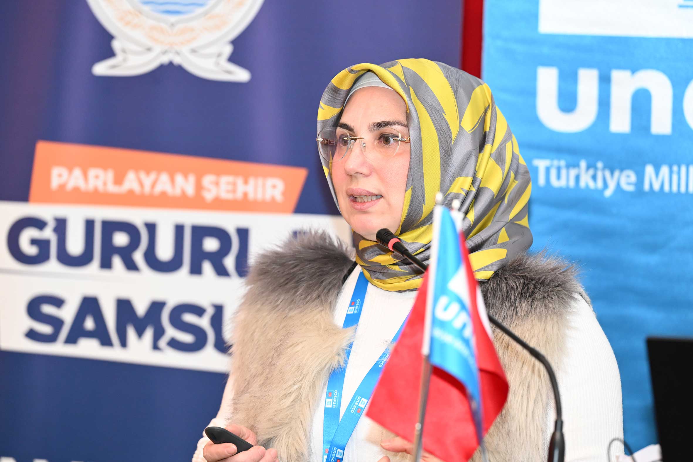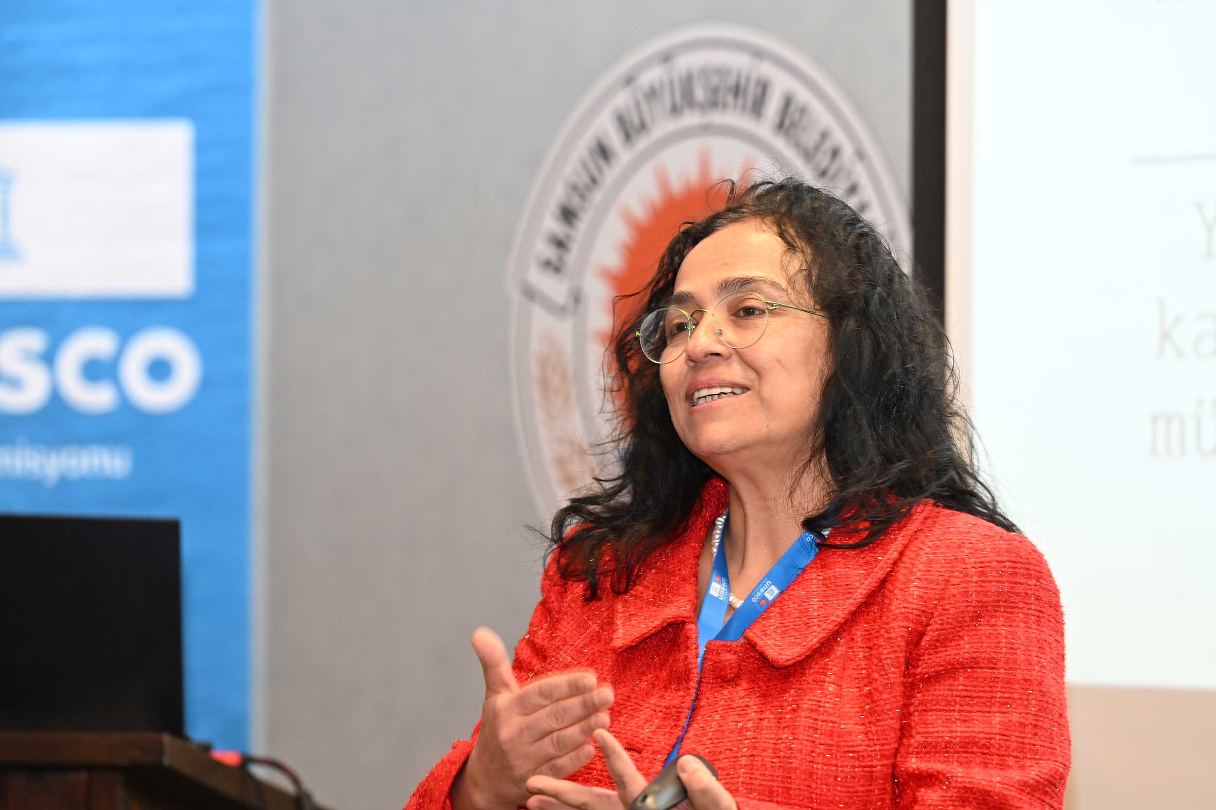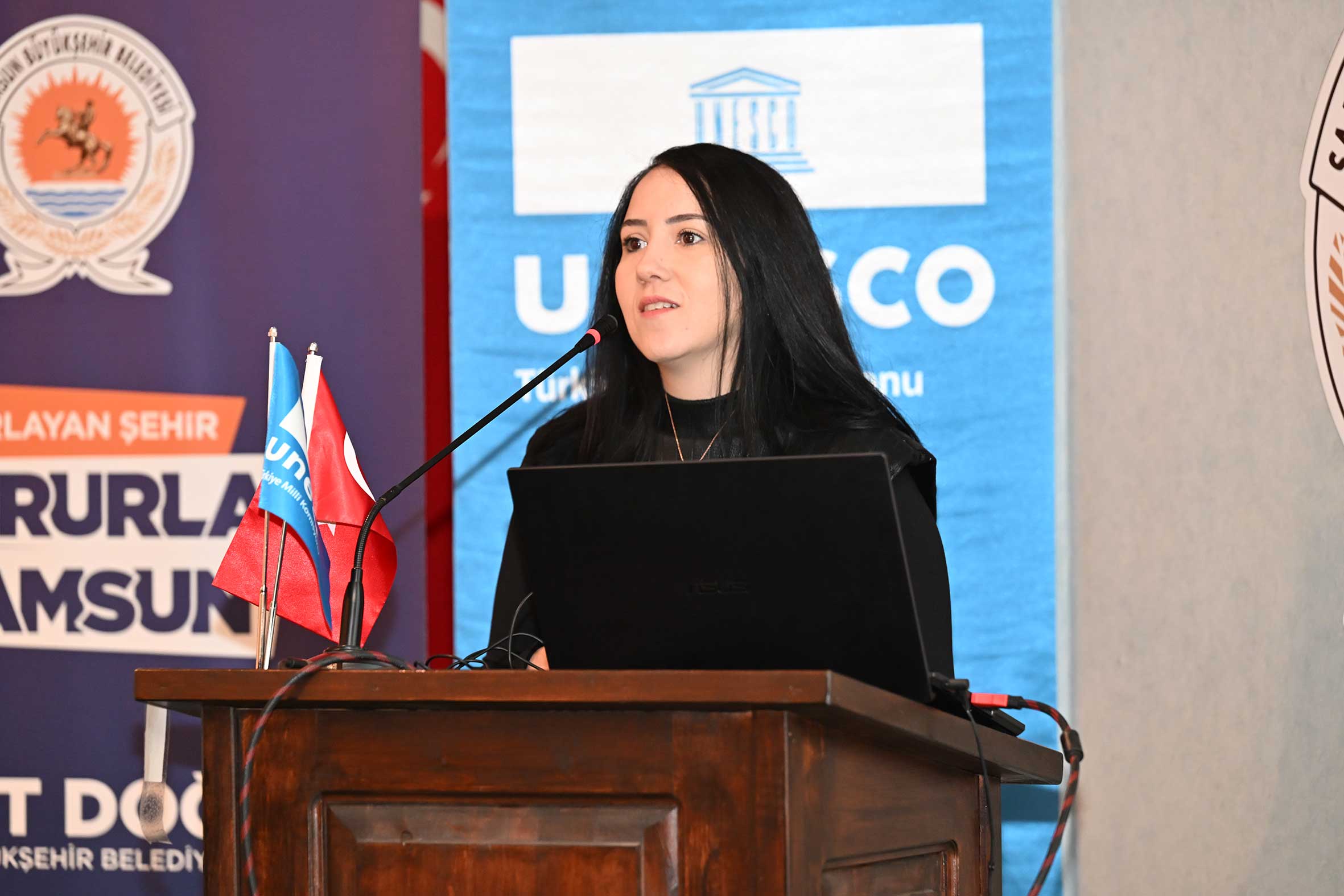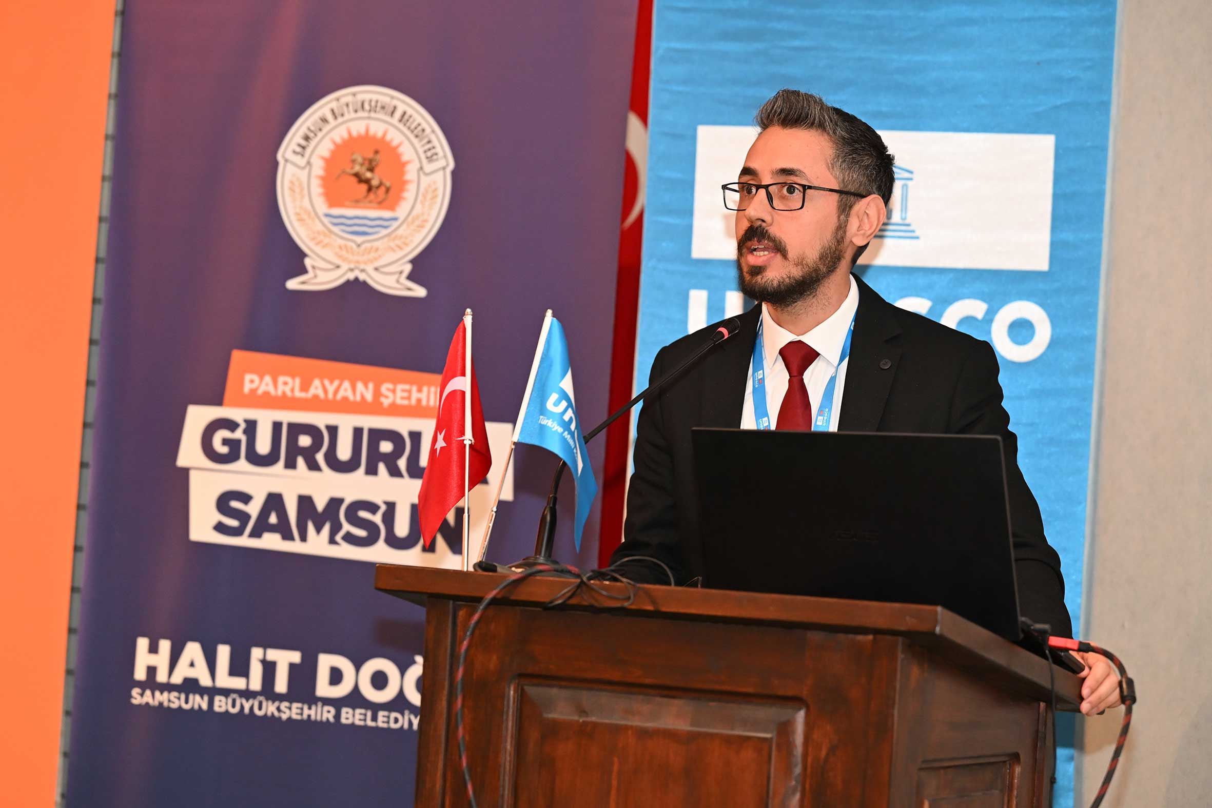 Açılış konuşmalarının ardından UNESCO Türkiye Millî Komisyonu Başkanı Prof. Dr. M. Öcal OĞUZ “UNESCO Programları, Yerel Yönetimler ve Somut Olmayan Kültürel Miras Müzeleri” başlıklı sunumunu gerçekleştirdi. Sayın OĞUZ, sunumunda Samsun’un UNESCO listelerine kayıtlı miras alanlarıyla/unsurlarıyla UNESCO programları çerçevesinde yerel yönetimlerin ve müzelerin rolüne değindi. Ayrıca, somut olmayan kültürel mirasın korunması, yaşatılması ve aktarılmasında somut olmayan kültürel miras müzelerinin önemine dikkat çekerek bu müzelerin kurulma ve işletilme süreçlerinde yerel yönetimlerin izlemesi gereken temel ilke ve yaklaşımları ortaya koydu. Açılış konuşmaları bölümü UNESCO Türkiye Millî Komisyonu Başkan Vekili Sayın Prof. Dr. Nizamettin KAZANCI’nın “Jeomitoloji; Sözlü Miras ile Jeolojik Mirasın Buluşması ve UNESCO Yaklaşımı” başlıklı sunumuyla devam etti. Sayın KAZANCI, sunumunda jeolojik oluşumların sözlü kültür, mitler ve anlatılar aracılığıyla nasıl anlamlandırıldığını ele alarak jeomitoloji kavramının kültürel miras çalışmalarındaki yerini ortaya koydu.