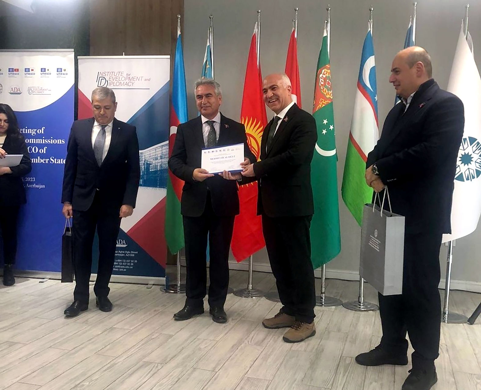 UNESCO Türkiye Millî Komisyonu Başkanı Sayın OĞUZ tarafından TÜRKSOY Üyesi Ülkeler UNESCO Millî Komisyonları Toplantısı’nın kurumsallaşmasına ve Türk kültürünün yaşatılmasına sağladıkları katkıları kapsamında Azerbaycan Kültür Bakanı Vekili Sayın Adil KERİMLİ, Azerbaycan Millî Komisyon Sekreteri Sayın Seymur FATALİYEV ve TÜRKSOY Üyesi Ülkeler UNESCO Millî Komisyonlarına hediye takdiminde bulunuldu. Program 8 Nisan 2023 tarihinde Türk Dünyası Kültür Başkenti Şuşa’da devam etti. Sayın OĞUZ’a dönem başkanlığı için plaket takdiminde bulunuldu.